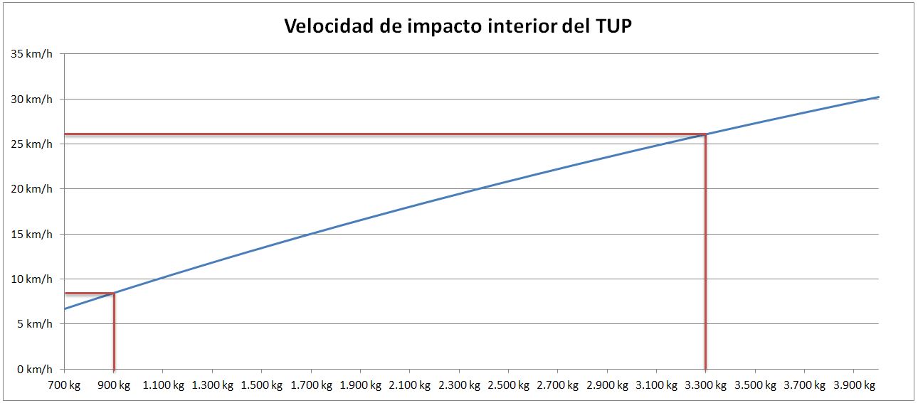 En el gráfico podemos observar que para vehículos pequeños monovolúmenes que pesan menos de 900 kg, el pasajero se golpea en el interior del TUP a 8,5 km/h que es como caerse corriendo. Si por el contrario, el vehículo de menor envergadura es una camioneta del tipo pick-up que pesan alrededor de 3.500 kg entonces el pasajero se golpea a 27 km/h que es similar a caerse de la bicicleta en alguna bajada.