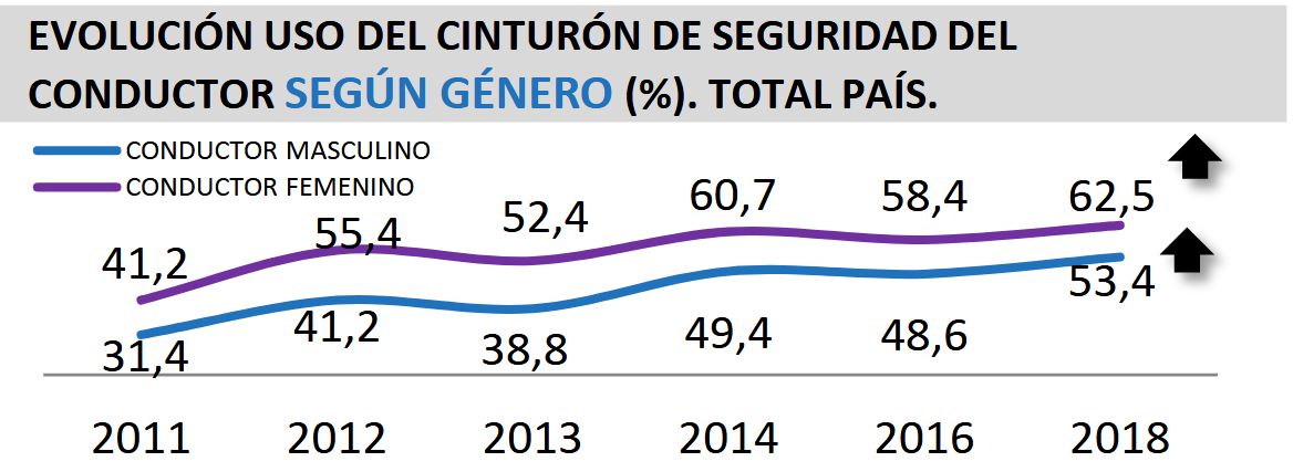 Del informe de situación de la seguridad vial en Argentina (2018 con datos del 2016) Se ha observado que las conductoras mujeres usan el cinturón en mayor medida que los hombres (58,4% versus 48,6% respectivamente). En el Estudio Observacional del comportamiento de conductores y ocupantes de vehículos motorizados de 4 (o más) y 2 ruedas (Enero 2019) esta tendencia aumentó a 62,5% para las mujeres y 53,4% para los hombres manteniendo la tendencia a lo largo de los años. Además, entendiendo que el uso del cinturón de seguridad de los demás pasajeros es responsabilidad del conductor, el uso del cinturón de seguridad en el resto de los pasajeros es mayor cuando el conductor es femenino (56,5%) que cuando el conductor es masculino (47,7%).